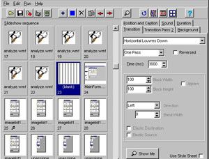Le lien IS de PTE est une « magouille » - géniale - mais qui ne permet pas cela. À aucun moment, on ne peut repérer simultanément une image particulière, l’effet de transition et le son associés. La prévisualisation du travail effectué doit repartir obligatoirement du début de la pseudo échelle de temps, c’est à dire du début du diaporama ! Il faut donc attendre, pour chaque travail sur une image, la prévisualisation des images précédentes... C'est à devenir fou dès qu'on s'attaque à des diaporamas de durée supérieure à une minute... La solution consiste à découper son diaporama de cinq minutes en cinq diaporamas d’une minute mais, ensuite, il faut tout recopier « à la main » car rien n'a été prévu pour conserver le timing des images et des transitions... Et lorsque l’on sait qu’il faut cliquer quatre fois, à quatre endroits différents, avant de pouvoir opérer le moindre changement de transition pour une image, on comprend que je n’hésite pas à qualifier d’exécrable la convivialité de ce logiciel !!!